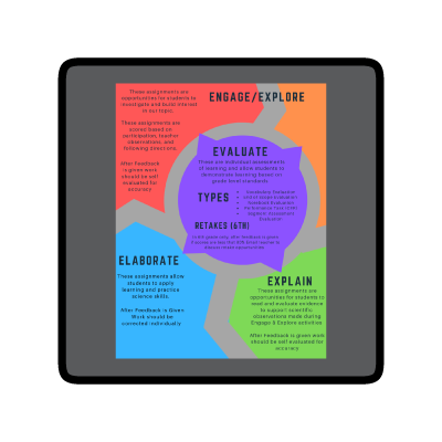 A few things to keep in mind; Zeros are given for missing assignments as a placeholder. That means being absent may result in a zero until the assignment is made up. Assignments that are turned in after the deadlines will be marked late in Powerschool, when this happens students will not necessarily receive feedback for their assignment, it may instead be exempted if attempted with honest efforts and no longer will impact the grade. Evaluations for 6th graders may be retaken, with their retake score capped at a maximum of 75%. Collaboration is very important in science class. Some assignments allow you to collaborate but you need to turn in your own work, if this is the case you can not turn in an identical answer someone you work with, and consequences will follow. In contrast, Group projects would never ask you to copy another students work as often they would require one file be submitted for the group.